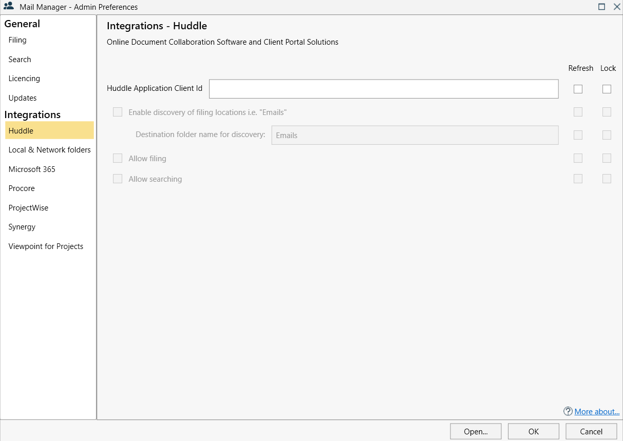 When selected Mail Manager will search Huddle for folders called "Emails" and make them available in the filing and search windows without the need to add the locations via collection files.